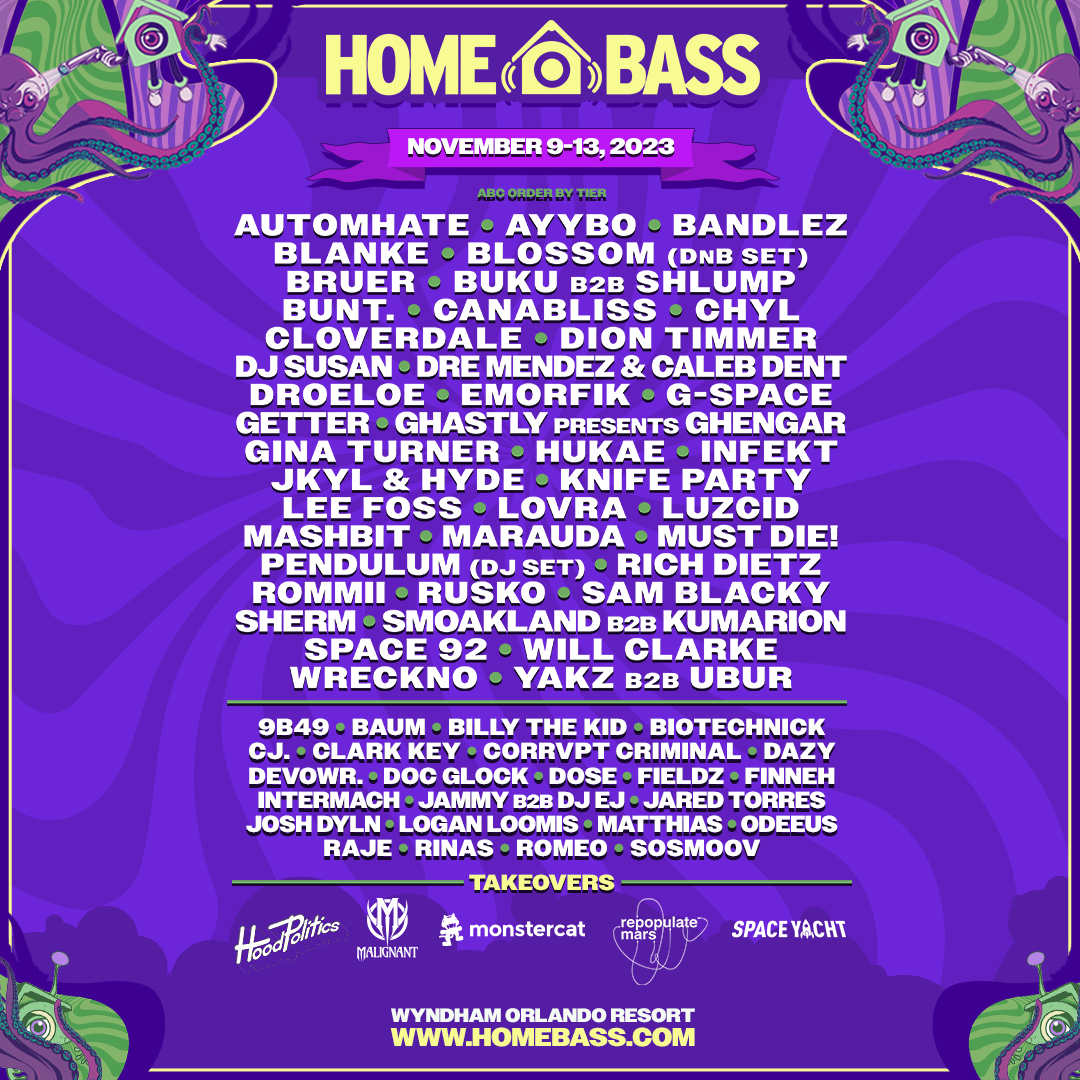 Back to All Events Home Bass Friday, November 10, 2023 12:00 PM Monday, November 13, 2023 6:00 AM Home Bass 8001 International Drive Orlando, FL, 32819 United States (map) Google Calendar ICS Buy Tickets