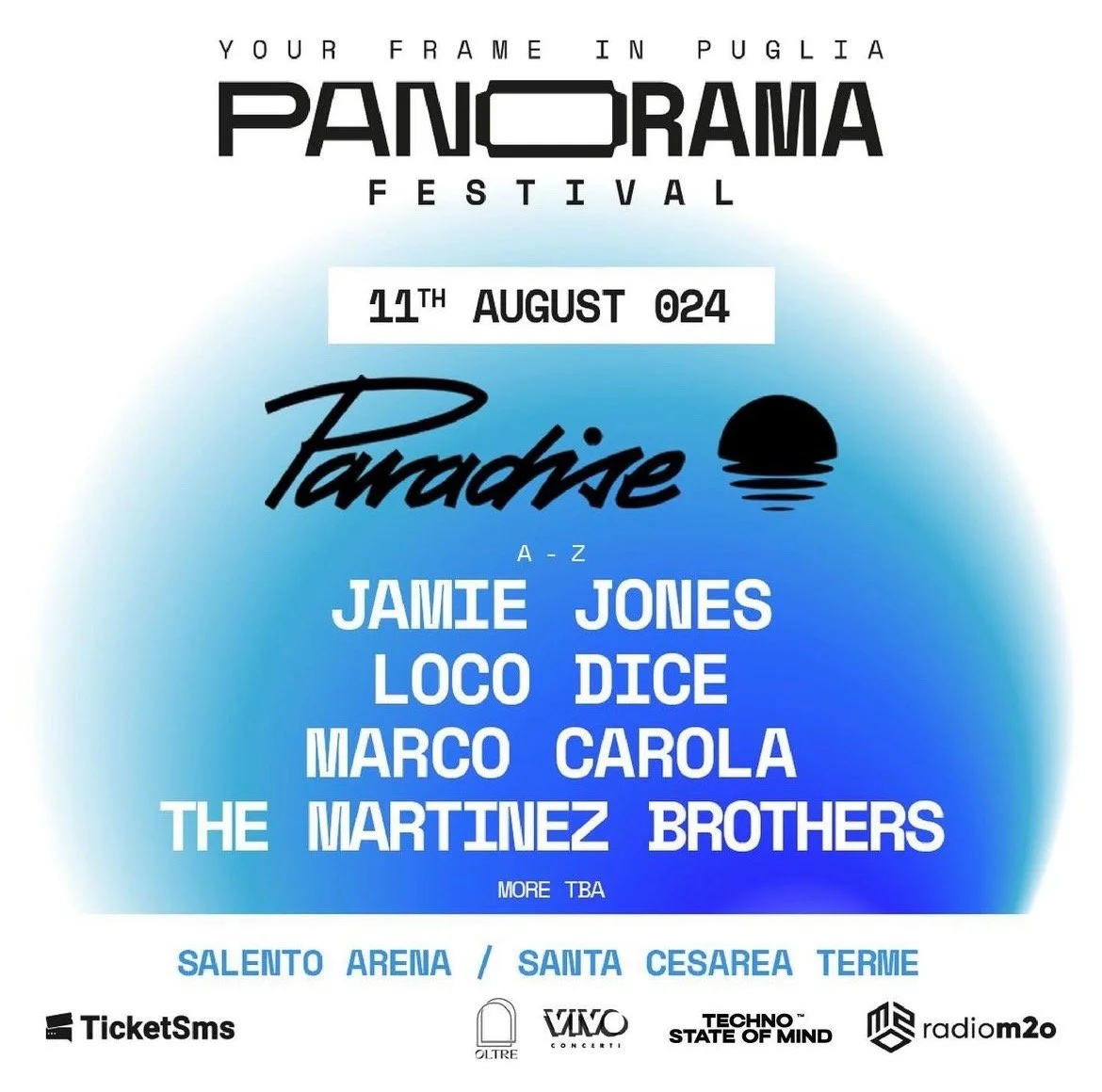 Back to All Events Panorama Festival, Puglia, Italy 2024 Sunday, August 11, 2024 12:00 PM Monday, August 12, 2024 4:00 AM Google Calendar ICS Get ready for this years Panorama Festival in Puglia, Italy. Featuring artists like Jamie Jones, Loco Dice, Marco Carola, The Martinez Brothers, and more TBA. This August 11th, 2024.