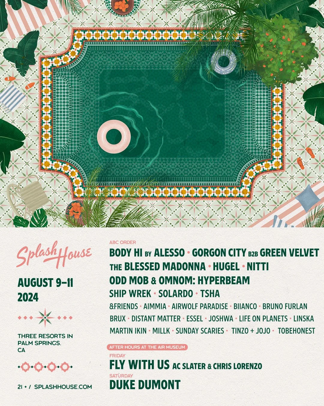 Back to All Events Splash House Weekend 1 Friday, August 9, 2024 12:00 PM Monday, August 12, 2024 2:00 AM Three Resorts (the Renaissance, Saguaro, and Margaritaville) lot 745 North Gene Autry Trail Palm Springs, CA, 92262 United States (map) Google Calendar ICS Buy Tickets