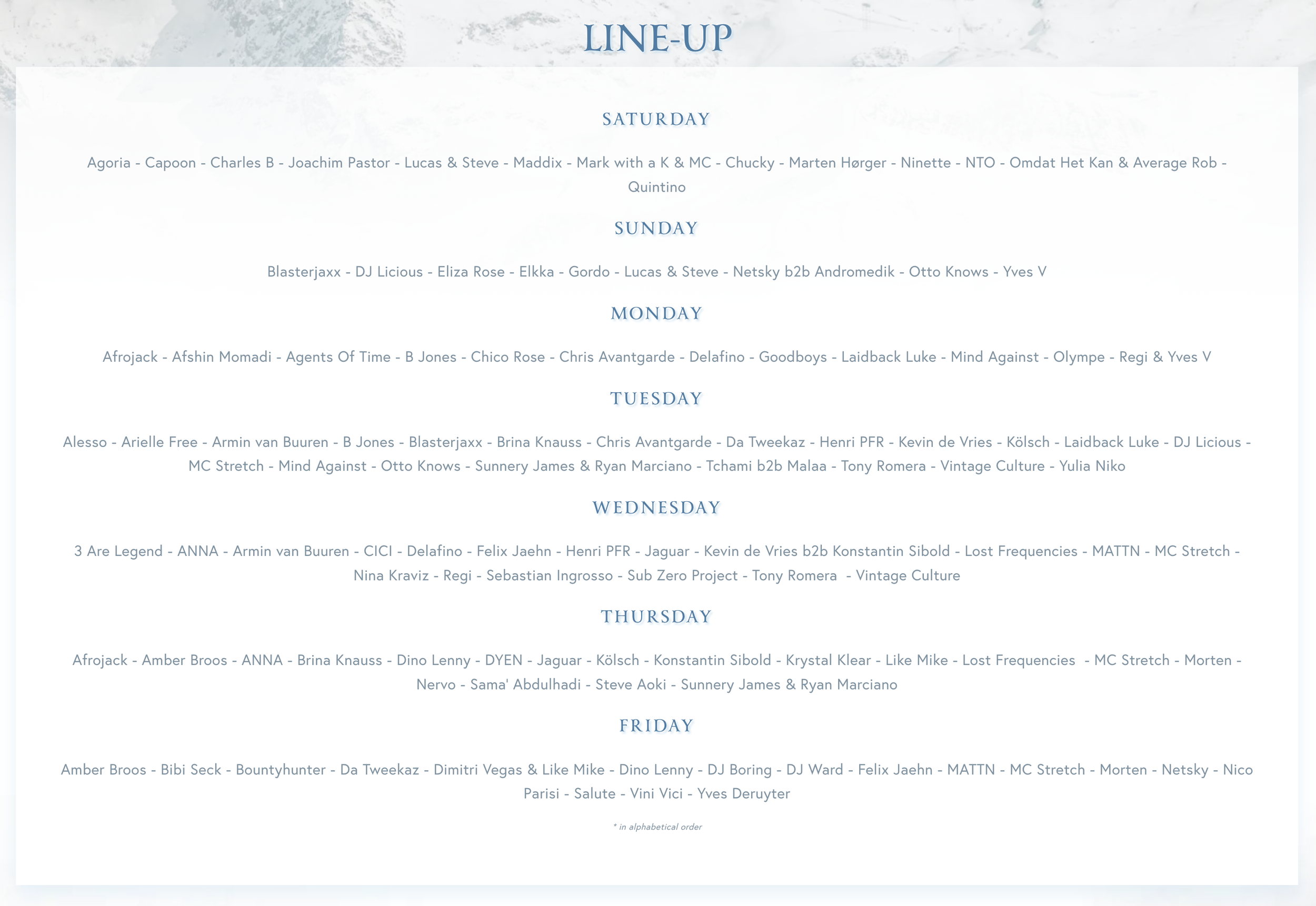 Tomorrowland Winter Saturday, March 16, 2024 3:00 PM Friday, March 22, 2024 11:55 PM Alpe d’Huez Huez, Auvergne-Rhône-Alpes, 38750 France (map) Google Calendar ICS Buy Tickets Click Here for More Information