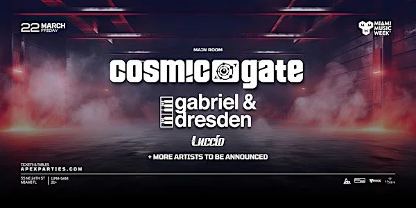 Cosmic Gate + Gabriel & Dresden Friday, March 22, 2024 11:00 PM Saturday, March 23, 2024 5:00 AM La Otra 55 Northeast 24th Street Miami, FL, 33137 United States (map) Google Calendar ICS La Otra Miami becomes the cosmic destination as Cosmic Gate takes the stage. Brace yourself for a sonic journey through their mesmerizing trance tunes and captivating stage presence. Buy Tickets