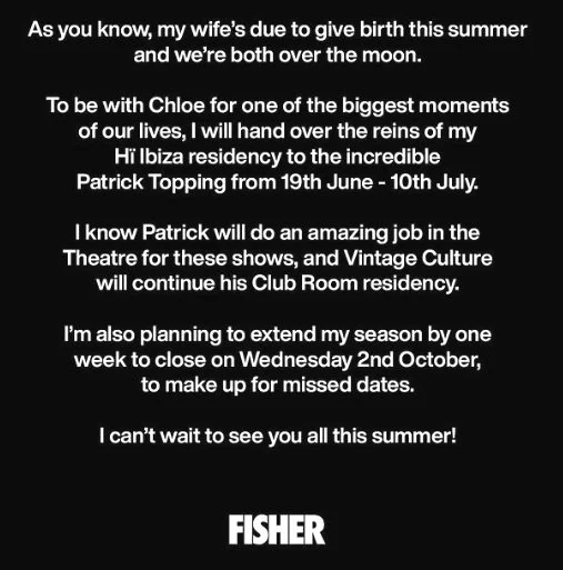 The news of FISHER's residency partial cancellation has been met with an outpouring of support and well-wishes from fans around the world. Many have taken to social media to congratulate the couple on their impending arrival and to express their excitement for FISHER's return to the music scene later in the season.