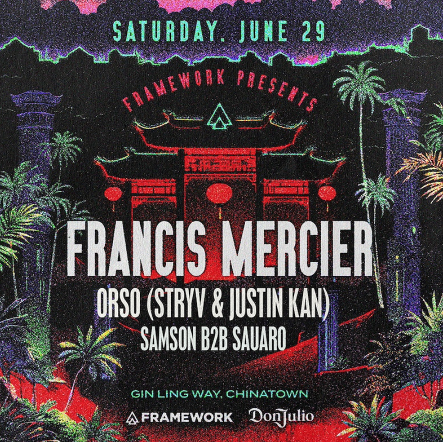 Taking place on Saturday, June 29, Framework Presents Francis Mercier represents the next chapter in a close-knit relationship between Framework and the highly touted afro-house DJ. Kobi Danan, one of Framework’s founders, takes pride in championing artists early on and helping facilitate their growth. Mercier is a perfect example of Danan’s hands-on artist development; Mercier’s sold-out performances at Sound Nightclub in 2022 and 2023 paved the way for Danan to book his headlining set at Gin Ling Way, which will mark his biggest Framework play to date. Framework Presents Francis Mercier wll feature support from Orso - the duo of Stryv (the co-producer behind the unreleased viral track “Move” with Adam Port) & Twitch co-founder Justin Kan - as well as Samson b2b Sauaro.