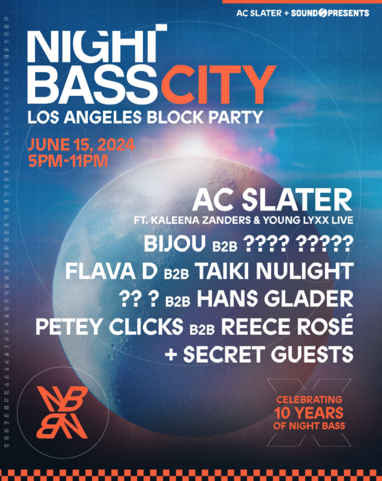 Night Bass City - Los Angeles Block Party will serve up six hours of bass-fueled performances, anchored by a headlining set from label boss AC Slater. The open-air soiree will also feature a diverse roster of talent such as Kaleena Zanders & Young Lyxx (who will join AC Slater on stage), BIJOU playing b2b with a surprise guest, Flava D b2b Taiki Nulight, another surprise guest playing b2b with Hans Glader, Petey Clicks b2b Reece Rosé, and other unannounced selectors. In addition to musical performances, attendees can explore the curated merchandise shop, taste bites from a variety of food vendors, or take a breather inside of Sound Nightclub, which will be open for patrons to cool down, with access to the bar and bathrooms.