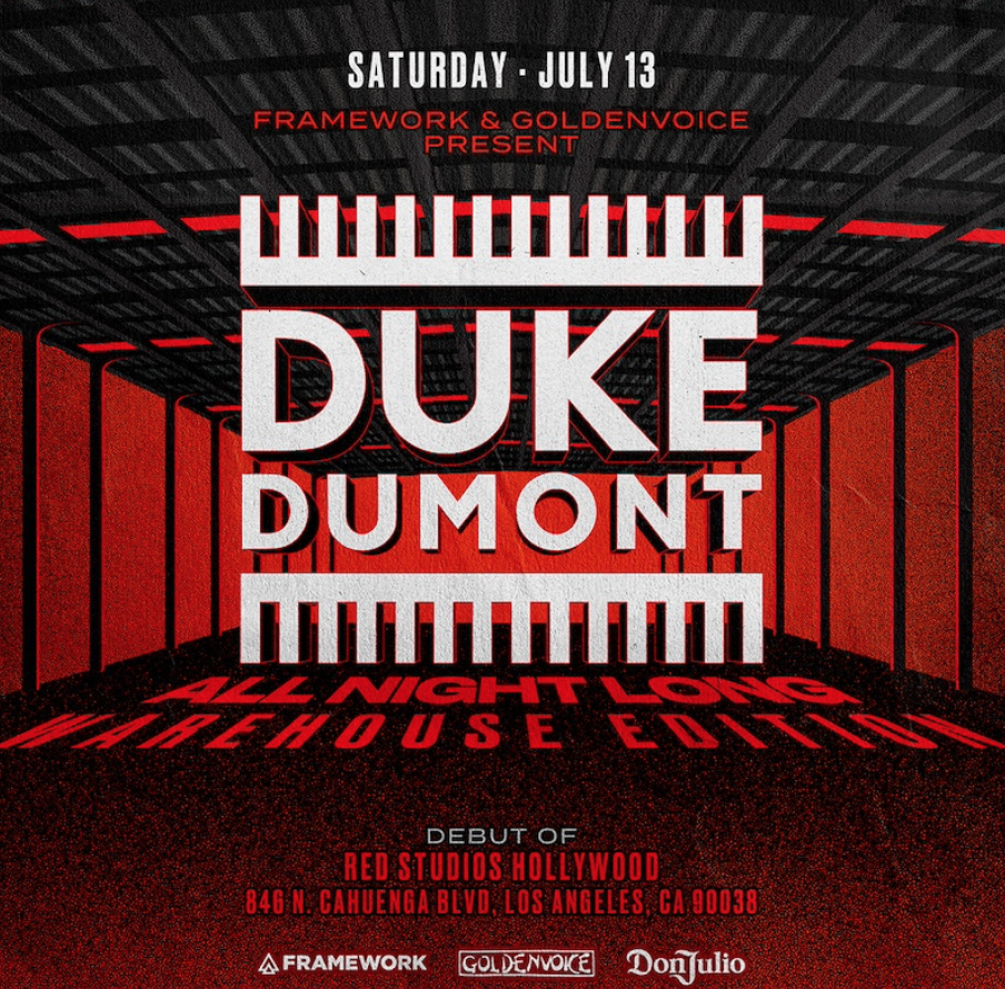 On the upcoming Duke Dumont All Night Long (Warehouse Edition), Framework co-founder Kobi Danan says, “At Framework, we like to transform gems across Los Angeles into unforgettable experiences. Red Studios isn't just a venue, it's a century of cinematic history located in our backyard, Hollywood. Presenting Duke Dumont with Goldenvoice will be the perfect way to debut this new historic venue space.”