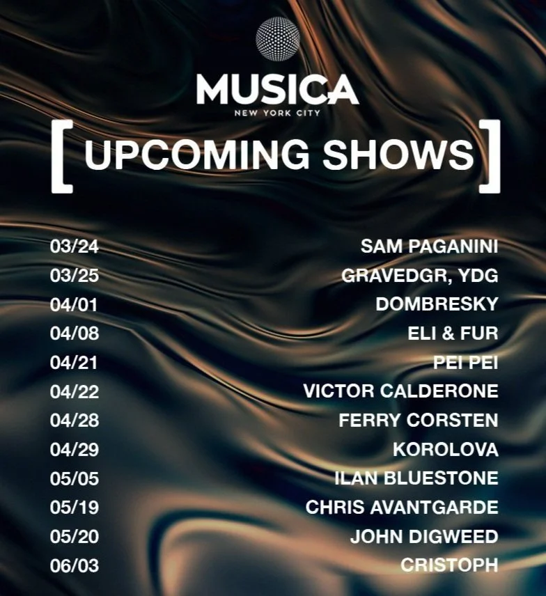 MUSICA’s upcoming lineup for the next few months is featuring artists ranging from tech house to techno to melodic techno and back again. With Dombresky playing on April 1st, dynamic female duo Eli & Fur on April 8th, and talented female artist, Korolova on April 29th, MUSICA is in for an energetic and electronic crowd that you won’t want to miss.