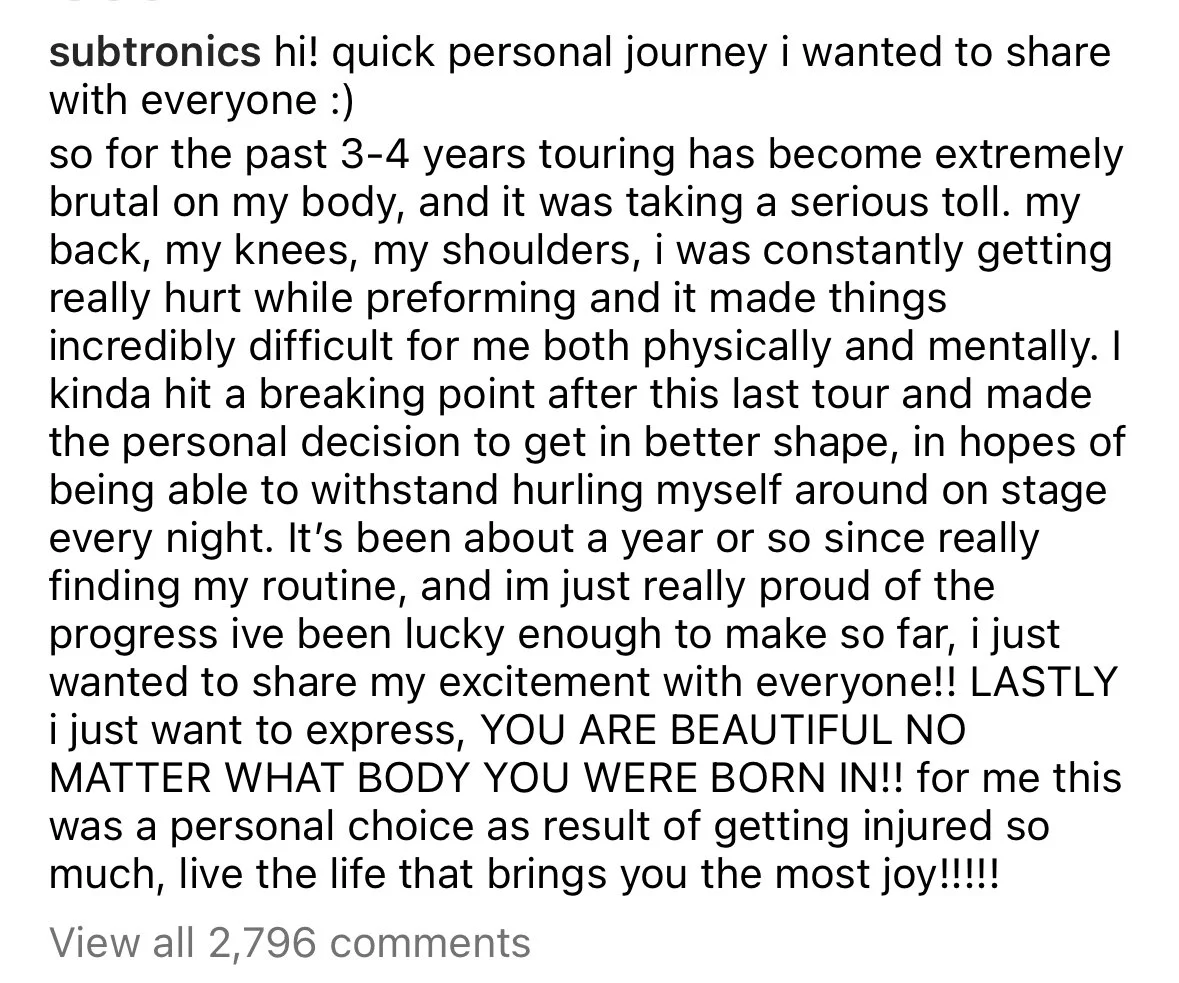 In his Instagram post, Subtronics also took a moment to deliver an important message of self-acceptance. He emphasized that everyone is beautiful, regardless of the body they were born in. For him, improving his physical health was a personal choice driven by the necessity to prevent further injuries. He encouraged his followers to live life in a way that brings them joy and fulfillment, reinforcing the idea that personal well-being should always come first.