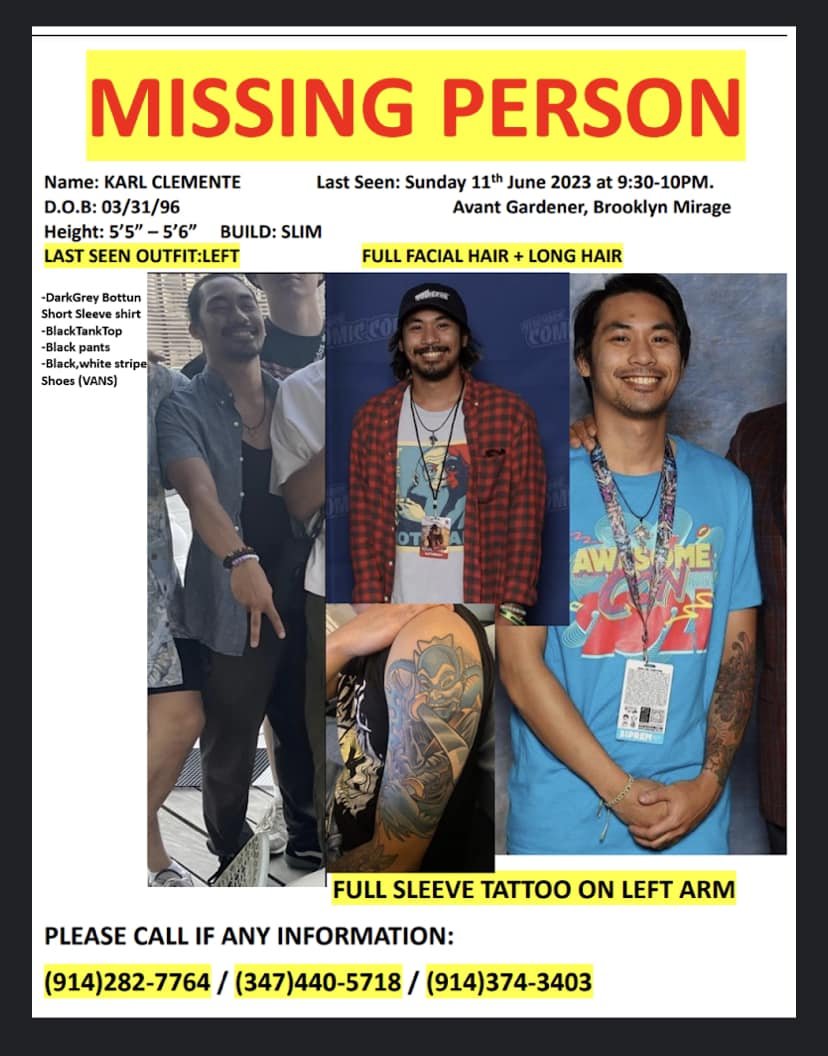 On Sunday, June 11th, Karl Clemente attended a concert headlined by Excision at The Brooklyn Mirage. His night took a turn when security turned him away for allegedly drinking alcohol. While most of his friends entered the venue without incident, Clemente was left outside. A Facebook post seeking information about him was later made, as he had not returned home since being turned away from the show.